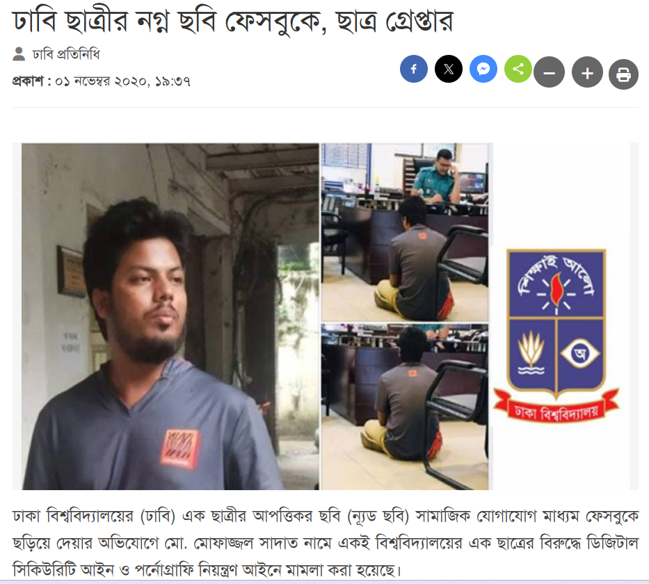 ২০২০ সালের মামলার এজহার সূত্রে জানা যায়, করোনা মহামারির শুরুর দিকে মোহাম্মদ মোফাজ্জল সাদাত নামে ঢাবির রাষ্ট্রবিজ্ঞান বিভাগের ২০১৮-১৯ সেশনের ওই ছাত্রের সঙ্গে একই সেশনের এক ছাত্রীর প্রেমের সম্পর্ক গড়ে ওঠে। ক্যাম্পাস বন্ধ থাকায় সেই সময়ে ফেসবুকে তাদের মধ্যে নিয়মিত চ্যাটিং, ভিডিও ও অডিও কথাবার্তা চলত। একপর্যায়ে তাদের মধ্যে গভীর সম্পর্ক গড়ে উঠলে সাদাত ওই ছাত্রীর সরলতার সুযোগ নিয়ে আবেগজড়িত কথাবার্তা বলে তাকে নগ্ন ছবি পাঠাতে বলে। সরল বিশ্বাসে ছাত্রীটি তার প্রস্তাবে রাজি হয়ে ছবি পাঠান। সাদাত এসব ছবি তার ফোনে সংরক্ষণ করে রাখে।