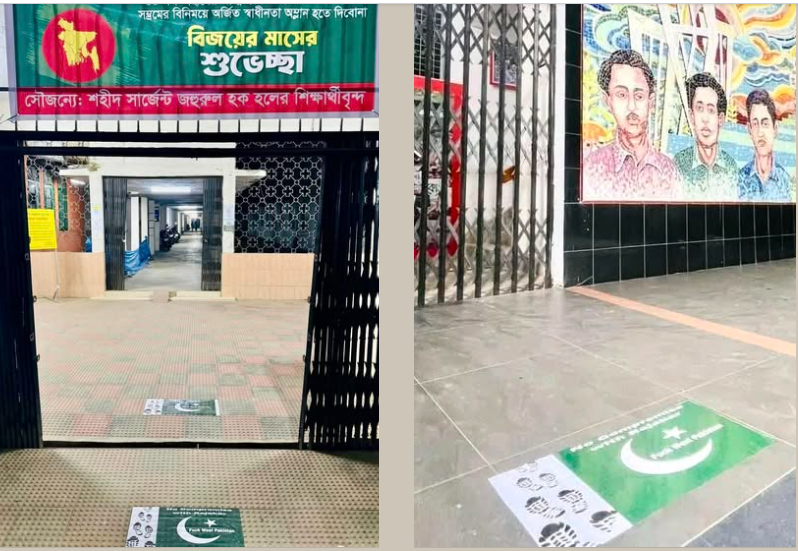 ঢাকা বিশ্ববিদ্যালয়ের (ঢাবি) শিক্ষার্থীরা বিজয়ের মাসে রাজাকার ও পাকিস্তানি বাহিনীর প্রতি তাদের ঘৃণা ও অসহিষ্ণুতা প্রকাশ করতে স্টিকার লাগিয়েছেন। ঢাকা বিশ্ববিদ্যালয় কেন্দ্রীয় ছাত্র সংসদ (ডাকসু) ভবনের প্রধান ফটকের সামনে এবং তিনটি হলের প্রবেশপথে পাকিস্তানের পতাকার ছবিসহ এ স্টিকার লাগানো হয়েছে।